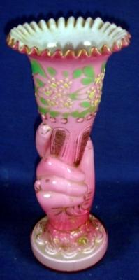 | Description / विवरण | Flower vase made of glass in the shape of a hand holding the vase on a circular platform. It is of pink colour and having floral design painted in the upper part and highlighted with golden colour. |