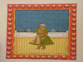 | Description / विवरण | It is a miniature painting of Maharaja Man Singh wearing a green dress and a turban is placed on his head. A golden drapery having blue and golden design is tied around his waist. He is standing on a designer carpet with the support of a stick. A fence is shown on backside. Some flowers shrubs are seen. The miniature has a golden and a broad red colour having white floral border outside. |