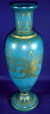 | Description / विवरण | Flower vase having high neck, long body and footed circular base. It is of blue colour and decorated with floral designs of golden colour. |