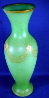 | Description / विवरण | Flower vase made of glass with circular base, round body, narrow long neck and slightly averted rim. On the outer surface some dots and chain designs are painted in golden colour. |