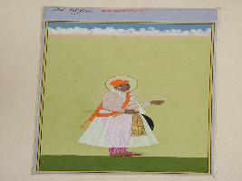 | Description / विवरण | It is a miniature painting of Maharaja Prithviraaj ji, painted on a deep green foreground and decorated in full dress wearing Angavastras, long skirt, saffron turban on head, kataar on side and shield at other side. He is shown holding a flower in protruding eyes and transparent costume. His waist band has floral and geometrical design over golden background. |