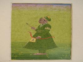 | Description / विवरण | It is a miniature painting of Shri Kishen Singh ji. Green clothes over green background in shades. He is wearing pearl jewellery and he is holding bow and arrows. |