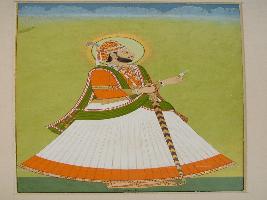 | Description / विवरण | It is a miniature painting of Maharaj Jagat Singh ji in standing position. It is his young age picture. A proud king in relaxed form. He is holding a sword in right hand, flower in left depicting his responsibilities as well as his soft side. Halo can be seen behind his head. Golden colour is used on the borders of clothes. |
