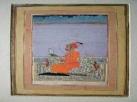 | Description / विवरण | It is a miniature painting of a Maharaja Kishan Singh ji shown seated on bed and resting, bolster masand is behind him. A halo can be seen around his head. Golden colour work for pillow cover, black colour for shield and stylised check-board pattern end dot pattern ornamentation over bed-sheet is conspicious. |