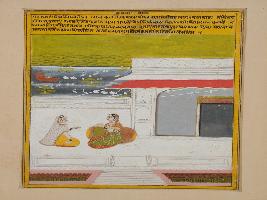 | Description / विवरण | This is a Ragini-Pata Manjari, in an architectural frame of terrace. Nayika is shown in intense aggressive mood and painted in a deep melancholic situation. She is weeping and one of her well wisher female is trying to persue her, and convince her. At the background, birds in a pair is shown, while at the foreground flowers are created. |