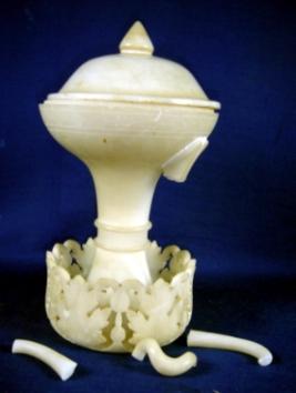 | Description / विवरण | Flower pot with lid having dish shaped body and long stand. There is a wall at the lower part having floral jali work. The lid has a conical knob. The handle is broken into three pieces. It is hollow inside. |