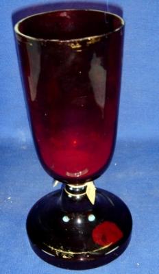 | Description / विवरण | Goblet made of glass in red colour having featureless rim round body and circular base. |