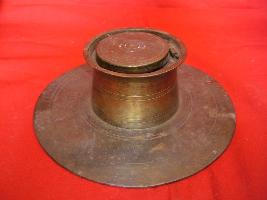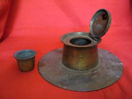 | Description / विवरण | It is an inkpot with flat and circular base and a cylindrical body with a lid, fixed by a clamp. The ink container is fixed by a groove. |