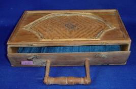 | Description / विवरण | Hand bag made of sandal wood, rectangular in shape with a handle. The outer surface has fan design at both sides having intricate weavings. The interior is padded with cloth at two sides. |