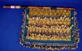 | Description / विवरण | Hand fan with wooden handle and made of cloth. Tiny beads are stitched in strings on the borders of the fan. |