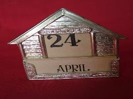 | Description / विवरण | It is a table calander in a hut shape with a card holder having names of the months and the dates. It has been made in Japan and is in silverfish colour |