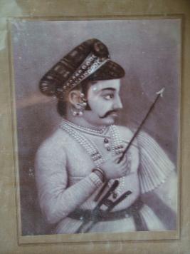 | Description / विवरण | This is a photograph of painting M. Mukund Singh in standing posture shown from almost lateral view. He is wearing a decorated crown, tunic, few chairs of beads. Also he is having a scarf in his waist. Moreover he is wearing ear ring. It is mounted in a wooden frame at present |