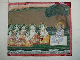 | Description / विवरण | This painting is shown the Ballav community. One person is sitting with a white dress, he is holding a patti text in his left hand and delivering speech. In front of him 8 persons are sitting. Seven person are reciting the name of their God by counting which is shown with a cloth covering their hands |