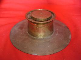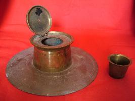 | Description / विवरण | It is an ink pot with a lid, a flat circular base and cylindrical body. The lid is fixed with a clamp. The ink container is fixed in a groove made in the base. |