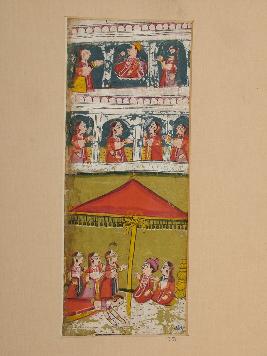 | Description / विवरण | This is a painting of marriage pandal in village. Is The pandal is having a cone shaped roof below it a couple and four female are shown. Above it sin Ladies and gents is shown in a balcony of a building |