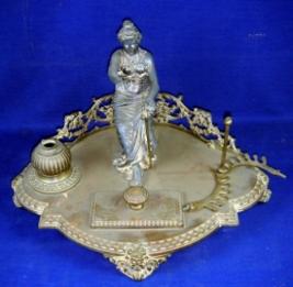| Description / विवरण | Ink stand with footed designed base. At the centre an European lady is seen in seated position holding a sword in her left hand. To her left a small ink pot is seen kept on a circular base. To her front a stamp with a knob and blotting paper at bottom is kept. |
