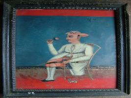 | Description / विवरण | It is a painting of Koshakonashant a king . He is sitting on chair. He is wearing black shoes, holding sword. A dog is sitting under the chair. |