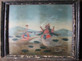 | Description / विवरण | It is a painting of God killing Dhenukasur and holding him from his hair. Buffalo male head is shown cut separate from body . Lord is shown holding tail of male buffalo with one arm. |
