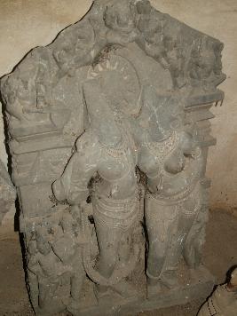 | Description / विवरण | It is an image of Siva Parvati. Their heads are missing. They are in tribhangi posture, richly ornamented. It has a Parikra, in which Brahma and Vishnu is clearly visible but without head. Besides this human figures are also carved. Bull is placed behind them, its head is chipped off. |