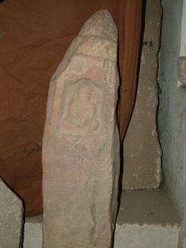 | Description / विवरण | It is a memorial stone dated samvat 1166 having irregular shape and conical on top. A seated position sage is placed in niche in upper portion. The figure is in seated posture. The figure has a long beard touching to the chest. Four lines which is written in Devnagari is visible, lower portion is chiseled. |