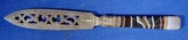 | Description / विवरण | Knife having thin iron handle with vine design in engraved and cut work. The handle is made of smooth stone. |