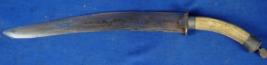 | Description / विवरण | Large chhuri knife having inwardly curved iron blade and curved horn handle with metal fittings. |