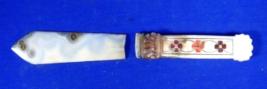| Description / विवरण | Knife having smooth stone blade and marble handle floral inlay work. The knife is broken into two pieces. |