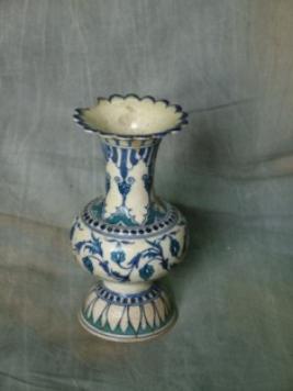 | Description / विवरण | A flower vase with globular belly, pedestal base, long and cylindrical neck and out turned rim. Floral motifs are done in blue colour on white background. |