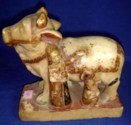| Description / विवरण | Stone cow in standing position on a rectangular stone pedestal. At one side child Krishna is seen milking the cow and Yashoda probably standing beside him. On the other side Balram probably is controlling the calf. |
