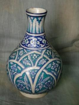 | Description / विवरण | Water pot having globular belly, slender neck and ring footed base. Floral and geometrical motifs in light blue colour on white background. |
