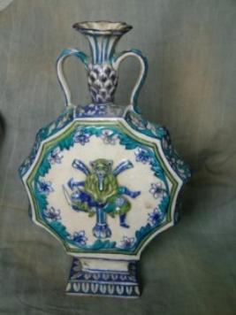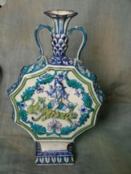| Description / विवरण | Pilgrim flask, flat bowled. Figure of Shiva and Narsingha Incarnation of Vishnu , blue and white. |
