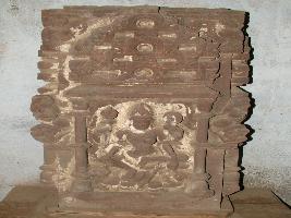 | Description / विवरण | It is a sculpture of flywhisk lady. It had four armed. In left hand trident is shown. A male is shown lying below right feet of flywhisk lady. |