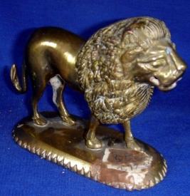 | Description / विवरण | Small brass statue of lion standing on an oval platform. |