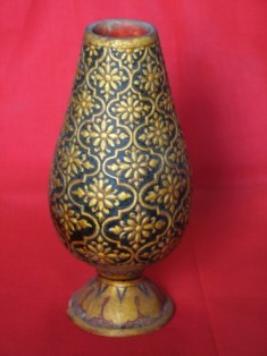 | Description / विवरण | Vase, black, lacquered pottery, raised ornamentation in golden color with floral designs. Lamp shaped. |
