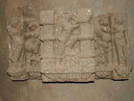 | Description / विवरण | This is a part of a door jamb, in which varaha one of the ten incarnation of Vishnu is shown uplifting the earth goddess with his mouth Katihasta Varaha is shown holding earth on his shoulder and his one leg rest on ground. He is flanked by vyala figures and female attendants. |