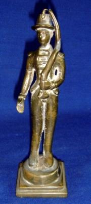 | Description / विवरण | Metal man depicted in standing position on a pedestal holding a musical instrument with left hand. He is wearing an ethnic cap and dress. |