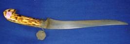 | Description / विवरण | Iron knife with single edged blade slightly carved , with hilt made of fish horn with designs. |