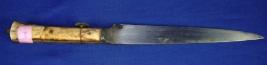 | Description / विवरण | Knife having straight single edged iron blade and ivory hilt which is partly broken at one side and has stains and cracks. |