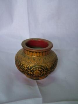 | Description / विवरण | Water pot decorated with floral designs in golden color on black ground. |