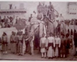 | Description / विवरण | It is the marriage photograph of Shri Sawai Maharaj Veerandra Shromani Dev of Alwar. The Palki is lifted by men near the building is shown. |
