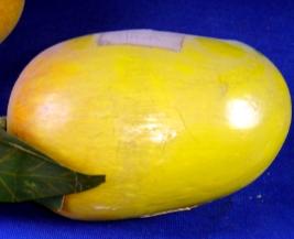 | Description / विवरण | Mango made of paper mache and painted in yellow colour with shades of red and green. It is kept in a bunch with two other mangoes and having three leaves. |