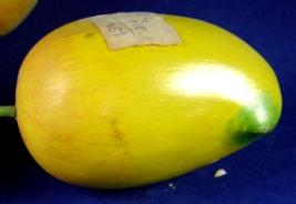 | Description / विवरण | Mango made of paper mache kept in a bunch with leaves and two other mangoes. It is of yellow colour with shades of green and red. |