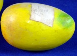 | Description / विवरण | Mango made of paper mache, in a bunch with two other mangoes and three leaves. It is of yellow colour with shades of green and red. |
