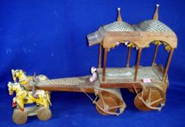 | Description / विवरण | Model of a chariot made of sandal wood drawn by two horses made of paper mache. The horses are kept on a wooden base having four wheels. A chariot rider is there. The whole chariot has intricate weavings and four wheels. |