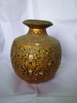| Description / विवरण | Water Pot. Globular pot is decorated with floral designs in golden colour on red ground. Lacquered, raised work. |