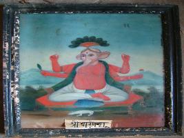| Description / विवरण | It is a painting of Ganesha. Ganesha is shown four armed holding his attributes. A rat is shown just below the Ganesha. He is sitting on Asana. Hill scenary had also located. |