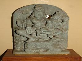 | Description / विवरण | Sitted on Bull Nandi is sukhasana, four armed Shiva is shown with Damaru in one hand while other one in varada posture. His upper arm is broken while with fourth he is holding the Parvati. At the base female worshipper is carved at the side. |