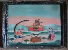 | Description / विवरण | It is a painting of Krishna. He is playing flute. A snake hood is in front of him. On left side a female is shown holding trident. |