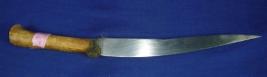 | Description / विवरण | Iron knife with single edged blade slightly band . The handle is made of fish horn. |