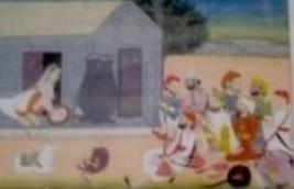 | Description / विवरण | The painting depicts a lady who is dressed in white cloth in front of a hut. Two pitchers are kept in front of her. Nine men Soldiers are sitting, some of them are smoking as well in front of her. A cow is sitting beside them. In the background, there is a tree, river in the grey colour & sky. |